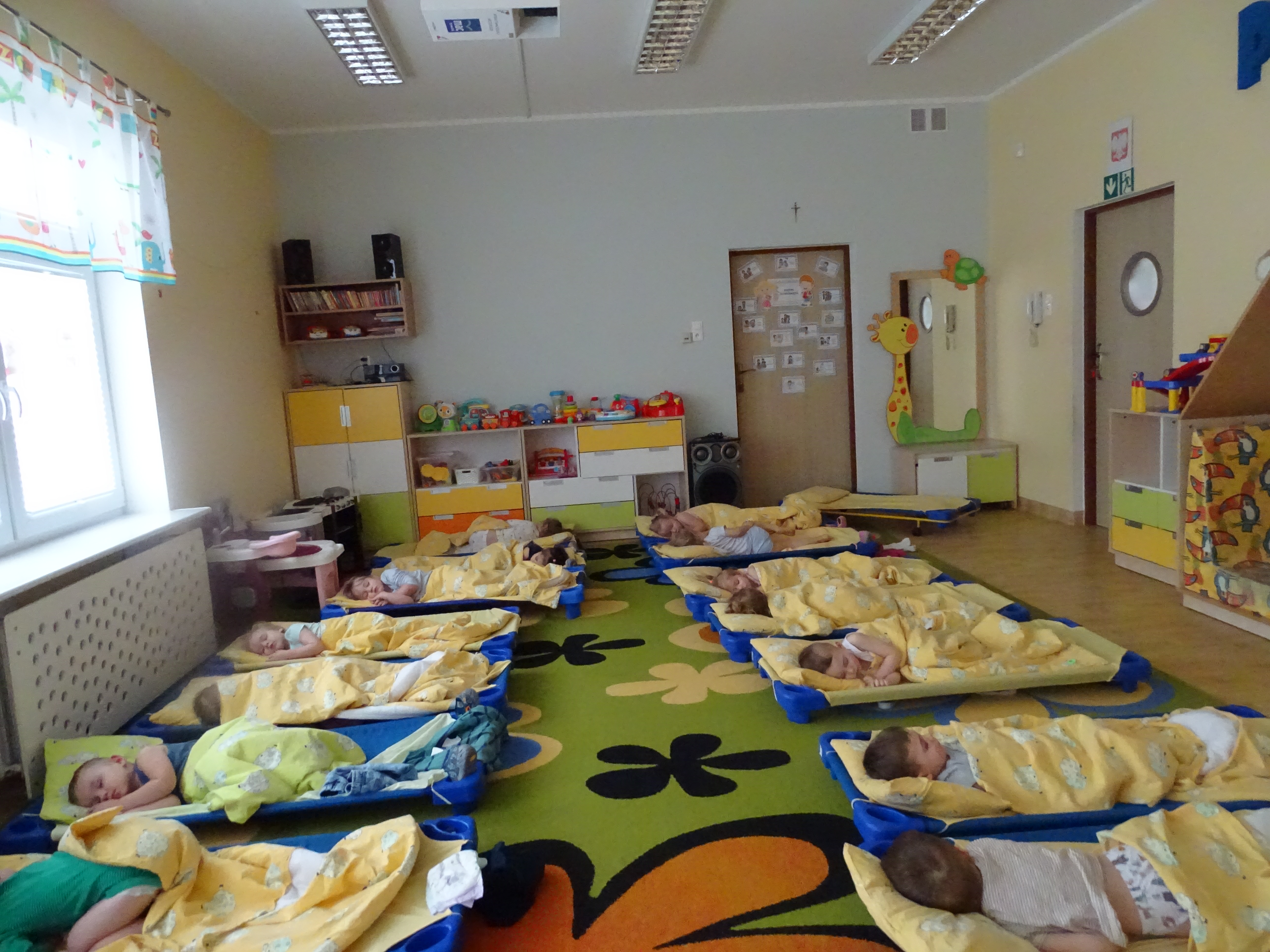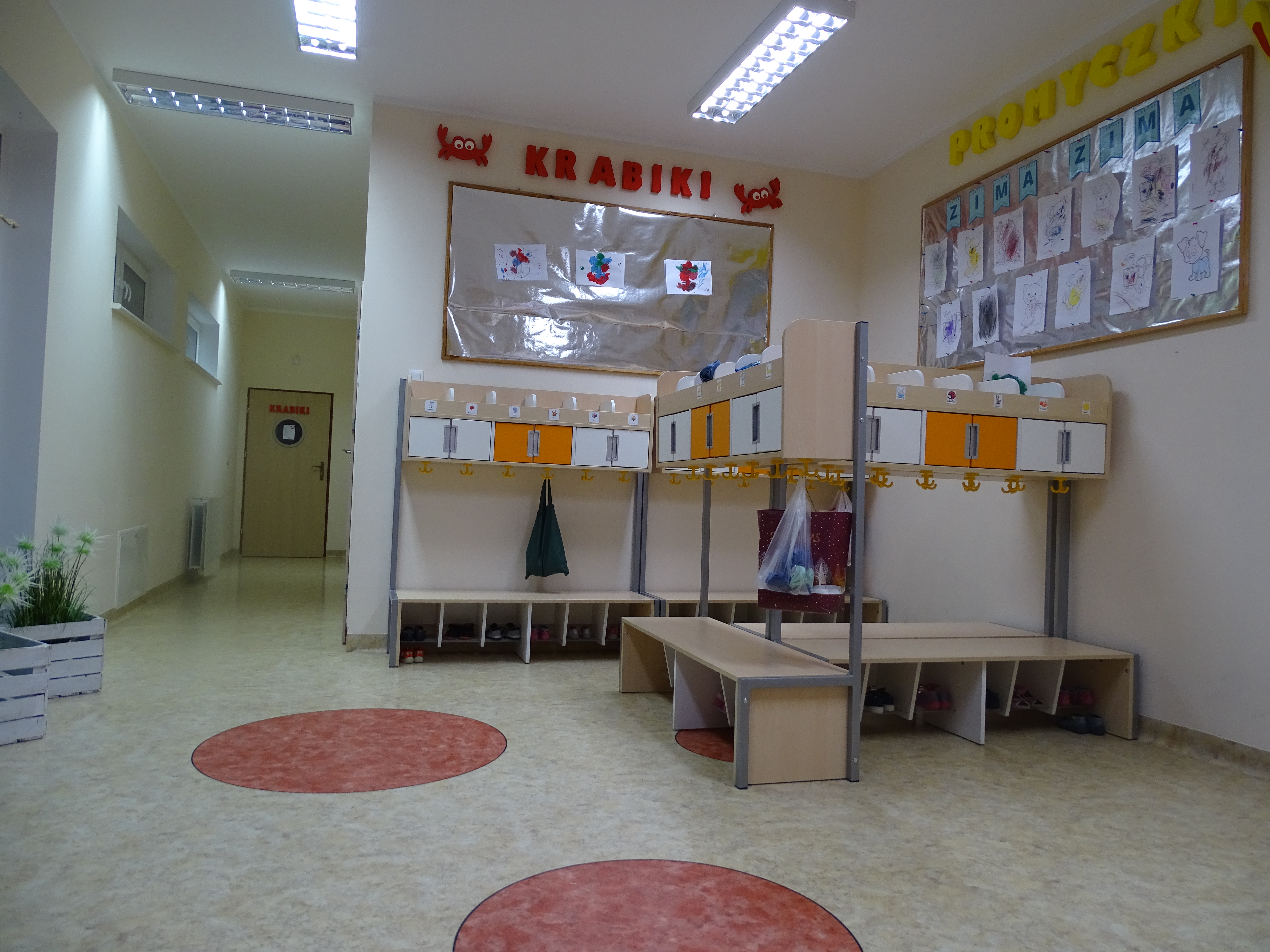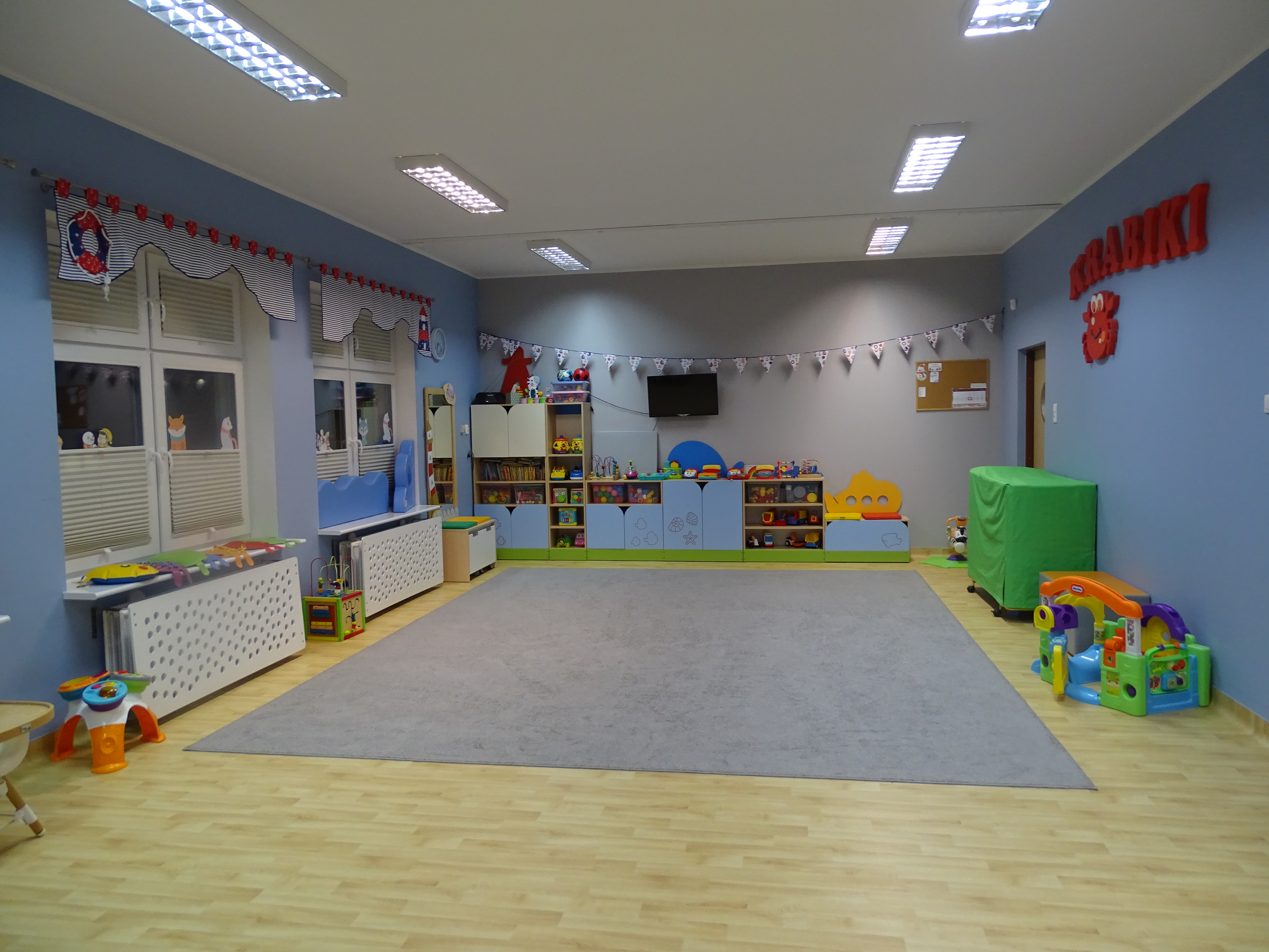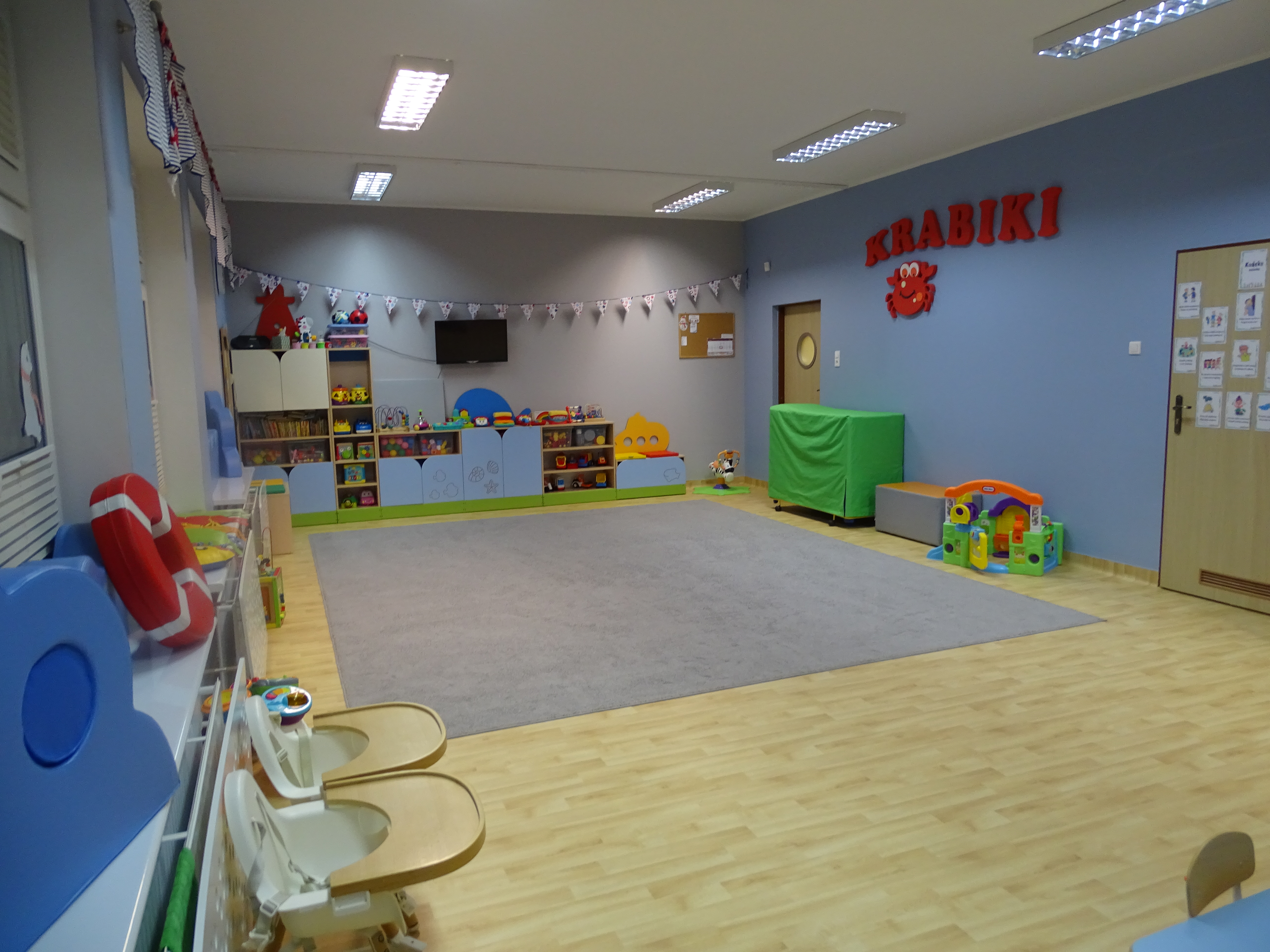 W naszym żłobku funkcjonują jedna grupa: Krabiki. Grupa liczy 20 dzieci, w wieku od 12 do 36 miesięcy. Nad grupą opiekę sprawują cztery wykwalifikowane opiekunki. W budynku znajdują się jedna sala przeznaczona do zabawy i prowadzenia zabaw oraz zajęć. Ponadto w żłobku jest przestronna szatnia, łazienka i aneks kuchenny, w którym wydawane są posiłki, przygotowywane przez panie kucharki w kuchni przedszkolnej. Posiadamy również własny plac zabaw, odpowiednio dostosowany do wieku i potrzeb dzieci.