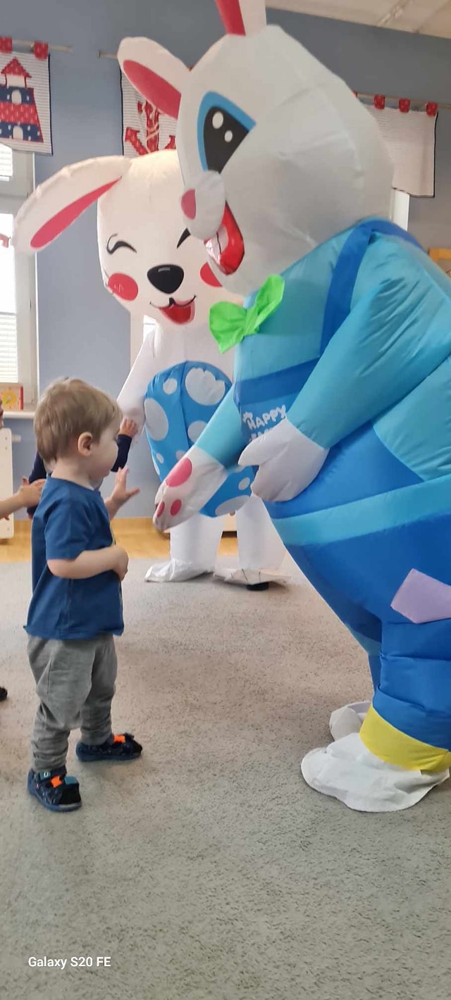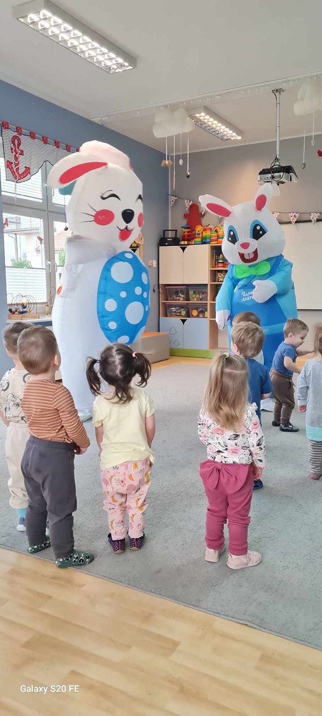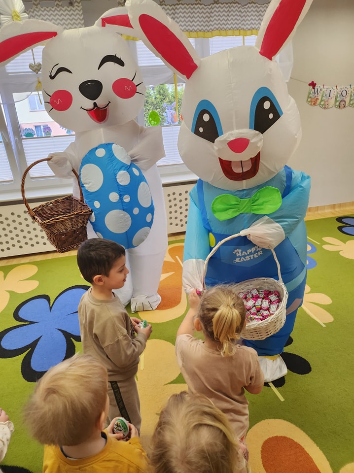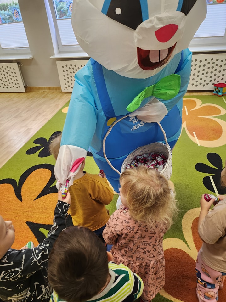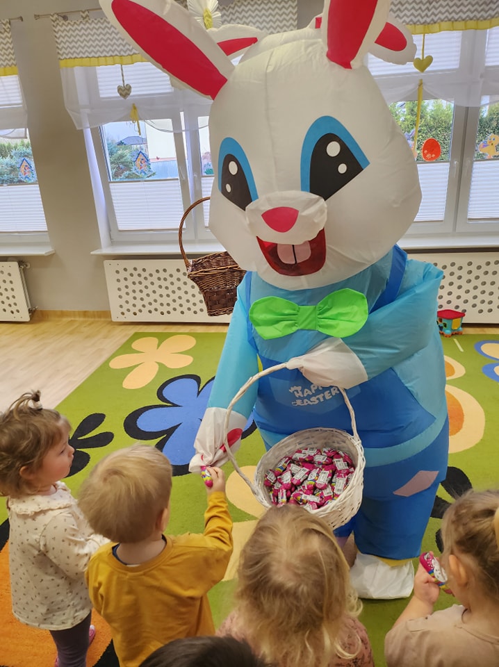 W dniu dzisiejszym do dzieci przybyli niecodzienni goście -Zajączki Wielkanocne. A że święta tuż,tuż,zatem Zajączki przyniosły dzieciom słodkie upominki.Mili goście podobali się wszystkim dzieciom,a te odważniejsze dołączyły do radosnych tańców z Zajączkami. Uradowani goście podziękowali dzieciom i obiecali ,że w przyszłym roku także przykicają do naszego żłobka.Dziękujemy Zajączki za wizytę i na pewno o obietnicy będziemy pamiętać.