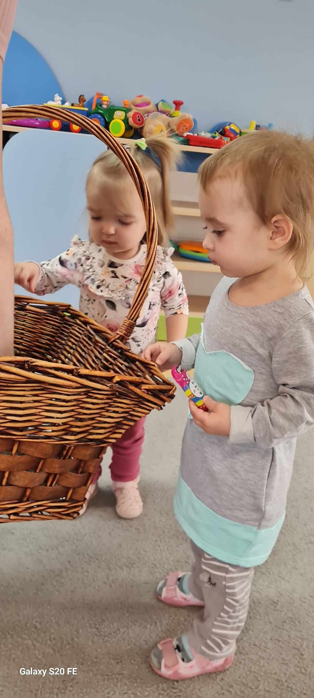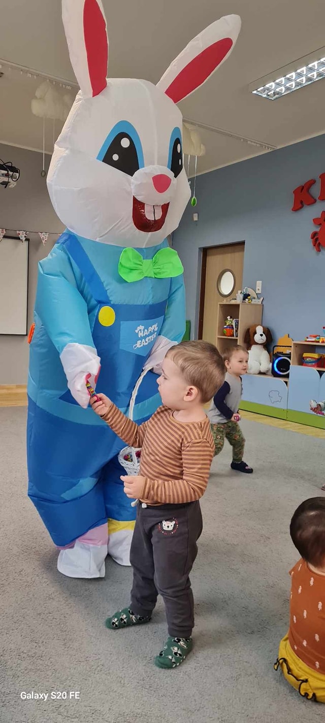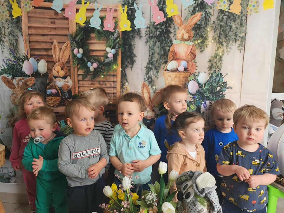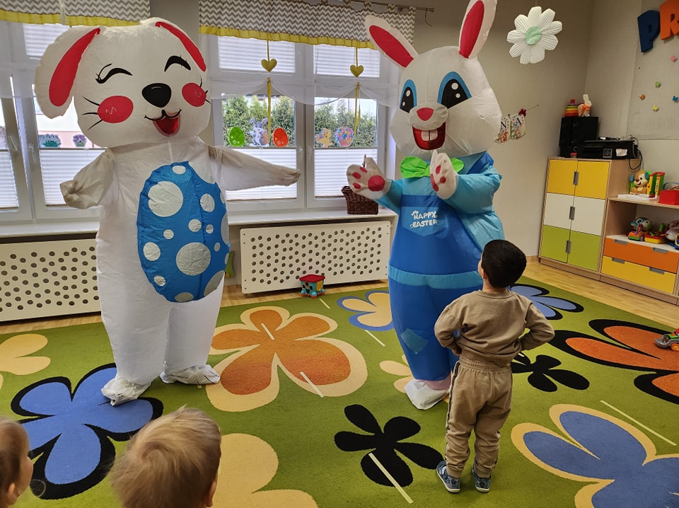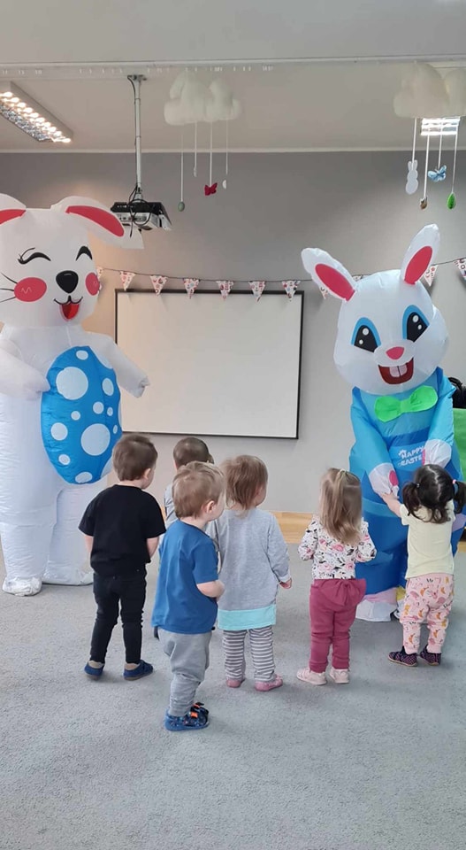W dniu dzisiejszym do dzieci przybyli niecodzienni goście -Zajączki Wielkanocne. A że święta tuż,tuż,zatem Zajączki przyniosły dzieciom słodkie upominki.Mili goście podobali się wszystkim dzieciom,a te odważniejsze dołączyły do radosnych tańców z Zajączkami. Uradowani goście podziękowali dzieciom i obiecali ,że w przyszłym roku także przykicają do naszego żłobka.Dziękujemy Zajączki za wizytę i na pewno o obietnicy będziemy pamiętać.